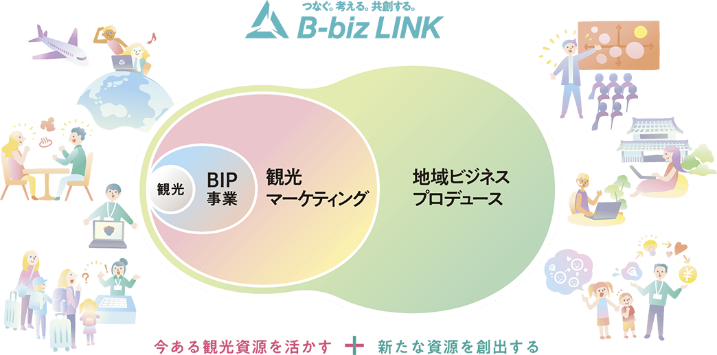 B-biz LINKは、地域ビジネスプロデュースと観光マーケティングの2軸から成り立っており、それぞれに専属スタッフを配置。