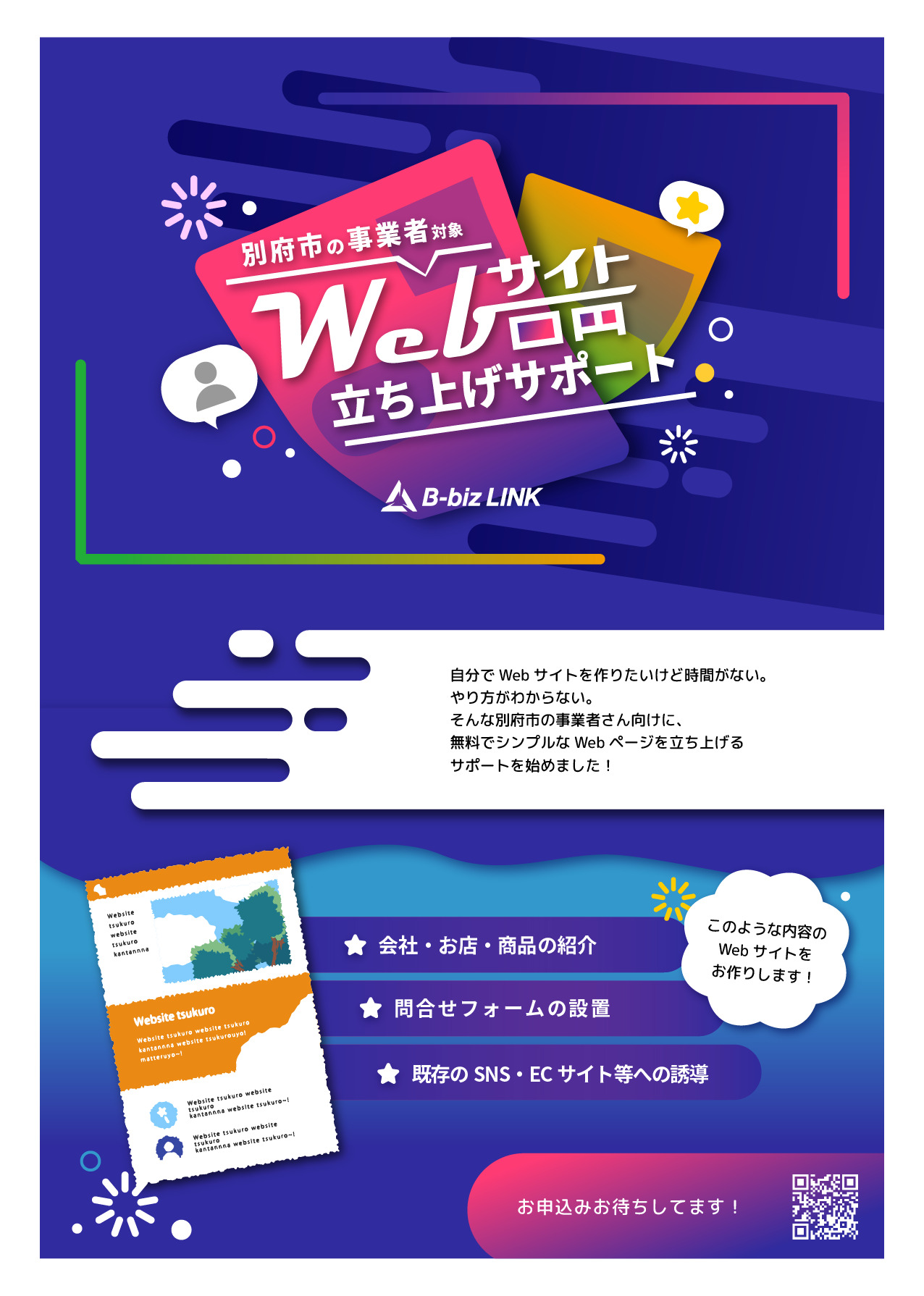別府市の事業者様向けに、会社・お店の簡単なWebサイト(LP:ランディングページ)を無料で立ち上げるサービスを行っております。