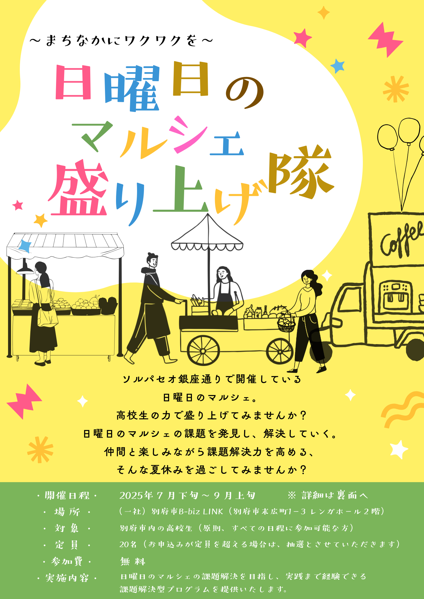 「日曜日のマルシェ盛り上げ隊」とは、毎月最終日曜日にソルパセオ銀座通りで開催される「日曜日のマルシェ」を題材に、そこで発見した課題の解決を目指して、実践まで経験できる課題解決型プログラムです。今回は、別府市内の高校生を対象に、2025年7月下旬~9月上旬に実施いたします!