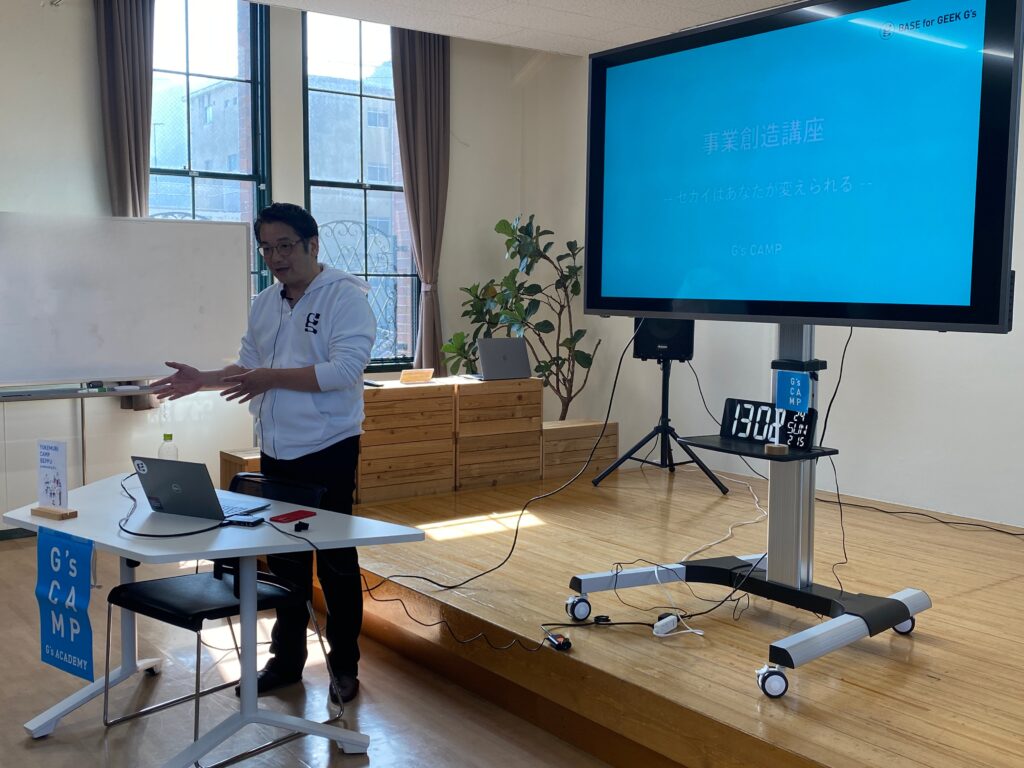 そして午後は児玉 浩康 さんによる事業企画講座からスタート。テクノロジーの誕生背景や、新しい価値を生み出してきた偉人たちの思考、そして自分自身の人生観を振り返るワークを実施。「自分は何をつくりたいのか」「誰のために届けたいのか」を深掘りし、“まずは100人に届ける”という視点で構想を練りました。
