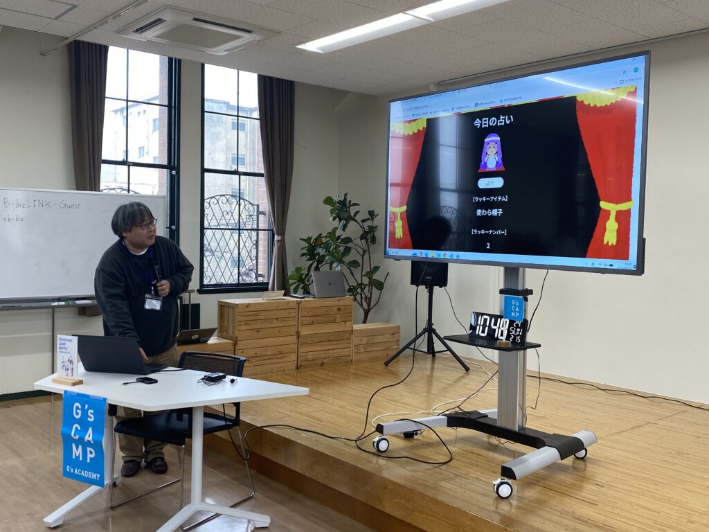 ボタンを押すと「大吉・中吉・小吉」がランダムで表示される仕組みです。自分で書いたコードが実際に動いた瞬間、会場には小さな歓声とワクワクした空気が広がりました。